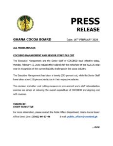 The Ghana Cocoa Board (COCOBOD) has announced salary reductions for its Executive Management and Senior Staff as part of efforts to address liquidity challenges facing the cocoa industry.
