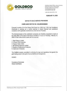 The Ghana Gold Board (GoldBod) has issued a compliance notice to several gold service providers, calling on their directors and owners to report to the Board’s head office in Accra for a routine financial and operational compliance exercise.