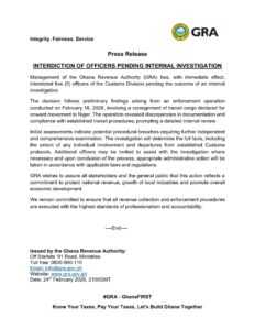 The GRA assured stakeholders and the general public that the move reflects its commitment to safeguarding national revenue and strengthening compliance within the Customs Division.