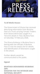 “The Government of Ghana has received disturbing information from Burkina Faso of a truck carrying tomato traders from Ghana, which was caught in a terrorist attack in Titao,” the release stated.
