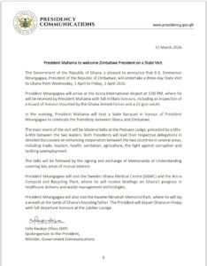 President John Dramani Mahama is set to host Zimbabwean President Emmerson Mnangagwa on a three-day State Visit to Ghana from Wednesday, April 1 to Friday, April 3, 2026.