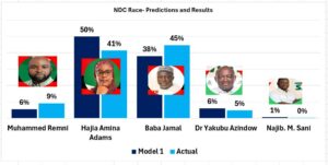 However, the biggest variations were recorded among the two leading contenders. Hajia Amina Adam, who was projected to obtain 50 per cent of the vote, ended with 41 per cent, representing an underperformance of nine percentage points and placing her six percentage points outside the model’s margin of error.