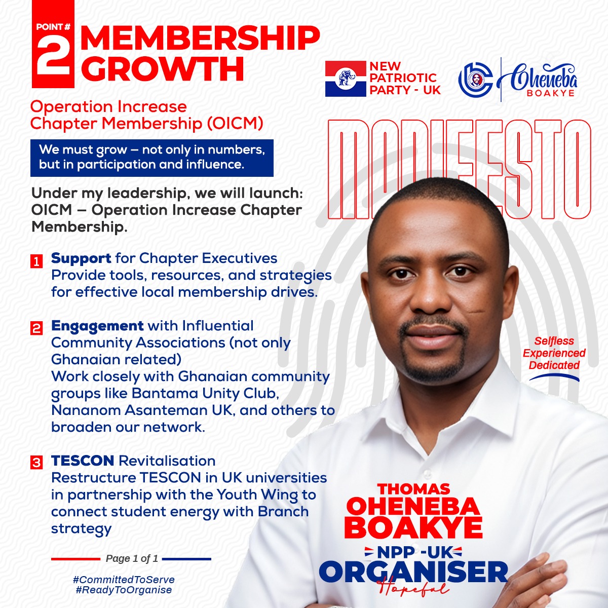 Aspirant for the position of Branch Organiser of the New Patriotic Party (NPP) in the United Kingdom, Thomas Oheneba Boakye, has unveiled a comprehensive plan aimed at strengthening the party’s organisational structures and expanding its membership base across the UK.