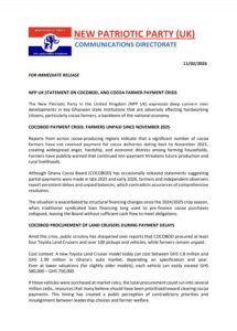 NPP UK attributed the payment challenges partly to structural financing difficulties that emerged during the 2024/2025 crop season. The party claimed that the collapse of the traditional syndicated loan arrangement, which had historically been used to pre-finance cocoa purchases, has weakened COCOBOD’s cash flow and its ability to meet payment obligations to farmers.