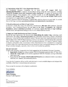 The appeal also points to what the Youth Wing describes as a contradiction between the PEC’s ruling and its own earlier directive. In a letter dated 26 August 2025, the PEC invited all TESCON Presidents from recognised tertiary institutions to register for inclusion in the presidential primary voters’ register, with the deadline later extended to 30 October 2025.