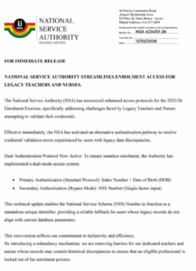 The National Service Authority (NSA) has introduced enhanced access protocols for the 2025/26 enrolment exercise, unveiling a new authentication pathway designed to resolve credential validation challenges, particularly for legacy teachers and nurses.