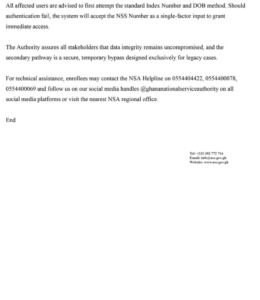 “All affected users are advised to first attempt the standard Index Number and Date of Birth authentication method,” the statement added. “Should authentication fail, the system will accept the NSS Number as a single-factor input to grant immediate access.”