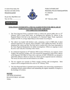 The vehicle and its contents have since been impounded at the Tema Regional Police Headquarters to assist with investigations. Police say efforts are ongoing to track down the driver and establish the ownership of the truck.